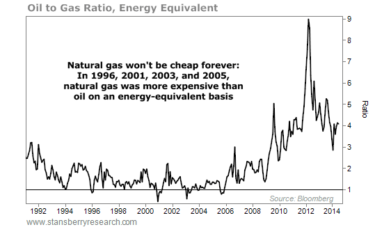 The big change in the dynamic of the natural gas market isn't shale production. It is the growing abundance of "associated" gas – that is, natural gas produced as a byproduct of oil production (not as a result of gas-specific drilling). Today, almost no dry-gas drilling is taking place in the U.S. Yet despite the steep drop in the natural gas rig count since 2009... natural gas supplies continue to grow. This suggests that natural gas prices are likely to remain low for as long as oil prices remain high.
