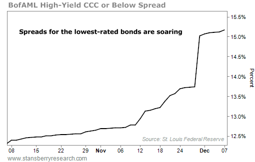 But if we look at just the riskiest high-yield bonds – those rated "CCC" or lower – we can see just how critical the situation has become...