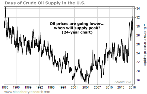 To make a bona fide "apples-to-apples" comparison to today's supply glut, we should measure the amount of supply relative to consumption. In 1983, the number of days' worth of supply in the U.S. hit a peak of 33.4. That's the largest amount of crude oil we've ever held in private storage, relative to demand. That's the all-time highest amount of "economic supply" – supply in relation to actual demand.