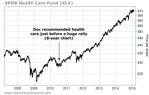 As you can see from the chart below of the SPDR Health Care Fund (XLV) – which holds a basket of some of the highest-quality names in health care – the sector had gotten crushed...