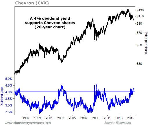 As you can see in the 20-year chart below, a 4% dividend yield is a special level for Chevron. The stock rarely trades low enough to have that big of a dividend yield... And when it does, the stock rebounds.