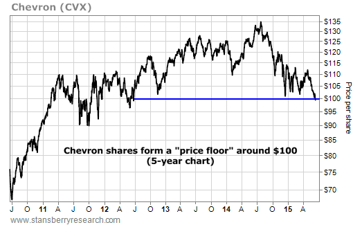 Just take a look at the chart below. Today, Chevron trades just above its lowest price of the last three years. Every time Chevron drops to these levels, traders and investors step in to buy... and push shares higher. This is called a "price floor." And Chevron has one at around $100.