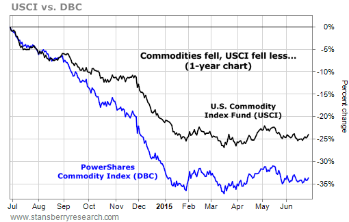 Take our commodity futures ETF, the U.S. Commodity Index Fund (USCI). This ETF is unique. It only owns commodity futures contracts where they're not trading in a "contango" pattern. (A market is in contango when delivery prices must converge downward to meet futures prices. Obviously, you don't want too own a commodity whose price is going to fall.) Likewise, this fund uses a simple trend-following strategy to stay out of commodities that are in a nosedive. These factors helped to greatly mitigate our losses as commodities collapsed over the last year and as oil prices have remained in contango.