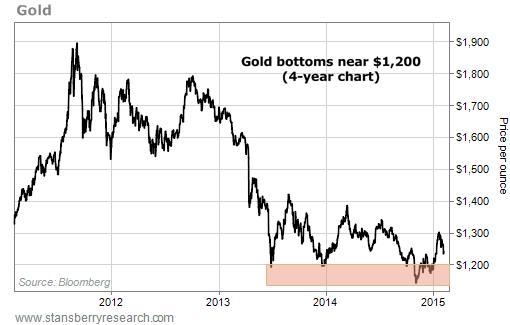 Finally, gold's price action is starting to look bullish again. Despite a rallying U.S. dollar (which usually moves opposite the price of gold), gold has rallied and is carving a bottom in the $1,200-an-ounce area...