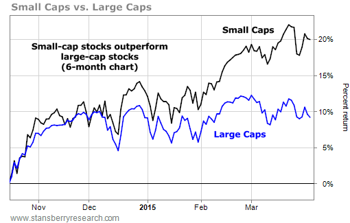 Out of fairness to Doc's Retirement Millionaire subscribers, we won't share the name of the small-cap company he recommended this month. But as you can see from the chart below, small caps have outpaced large caps since October...