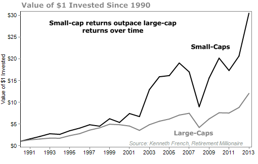 Economists Eugene Fama and Kenneth French provide a quality data set to show this. If you created an annual portfolio of the 30% of stocks that are the smallest on the market and compare it with the largest 30%, the small stocks make a lot more money. One dollar invested in 1990 in small caps would be worth $30.52 today. A dollar invested in large caps would have grown to $12.05.