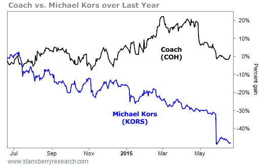 Many subscribers, though, criticized our recommendation. They argued that new brands, like Michael Kors, were going to wipe out Coach. Fashion is an area of the market where you should always "fade" the crowd. There are few permanent fashion brands. We doubted Michael Kors would become one. So to us, buying a well-proven, 50-plus-year leader in handbags made a lot more sense, especially considering the stock's low price (relative to cash earnings). Here's what's happened over the last year between Coach and Michael Kors...