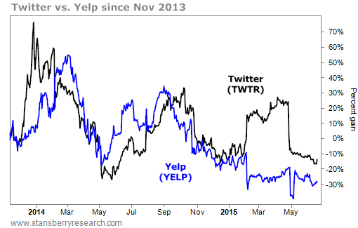 As a current example of what usually happens to these kinds of stocks, I'd point to the social-media service Twitter (TWTR) and online review site Yelp (YELP). Twitter is currently on our list, trading at $24 billion in market cap and 14 times sales. Yelp is a former Black Lister and currently trades at $3 billion in market cap and eight times sales.