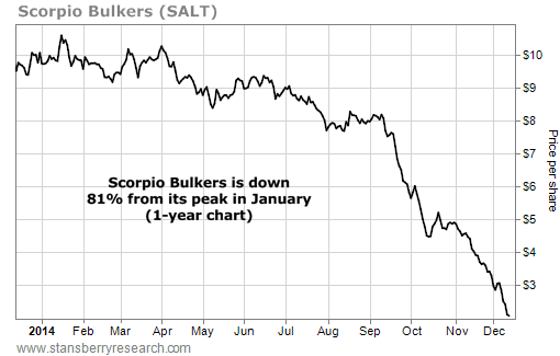 Take a look at this chart of Scorpio Bulkers... The company ships coal, iron ore, agricultural commodities, and other dry bulk goods. If you're looking for a sign of slowing global growth, this is it...