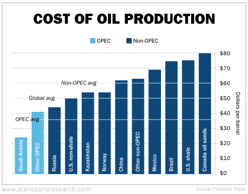 Finally, Petrobras is one of the highest-cost producers in the world. Its massive reserves are in super-deep water. And oil trading for less than $61 per barrel is squeezing the firm. Take a look at this infographic, which we've adapted from the Financial Times. As you can see, Brazil is one of the highest-cost producers in the world...