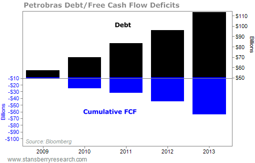 In addition to corruption, Petrobras is also horribly mismanaged (again, no surprise considering the Brazilian government's close involvement). Take a look at this chart Porter presented at our event in Nashville showing the company's mounting debts and shrinking cash flow...