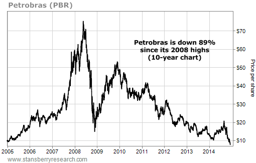 All of this adds up to Petrobras' struggling share price. Shares are down 64% since September nearly 90% from their mid-2008 peak...