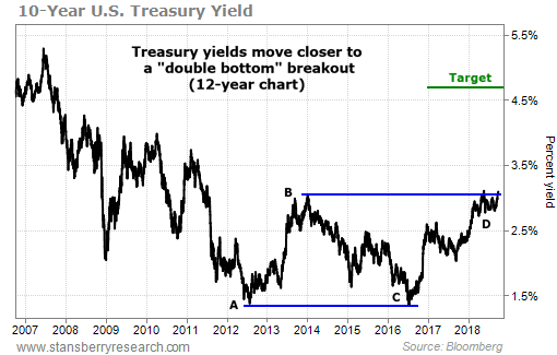 If 10-year yields break through [to a new high above 3.2%], it will complete a powerful trading pattern called a "double bottom." Here's how it works...