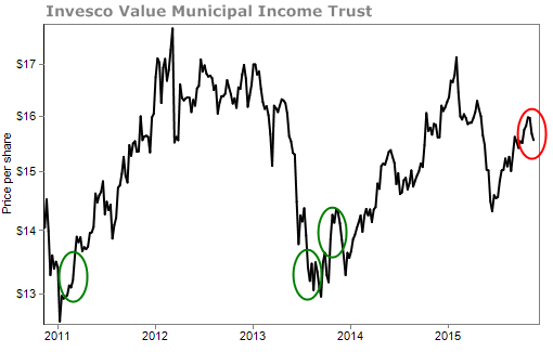 "What is happening with Invesco Value Municipal Trust (IIM)?" he wrote in an e-mail. "Doc Eifrig has been a proponent of this fund for several years. Since the first of November, the price has been rapidly sinking."