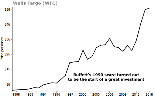 Rather than panic, Buffett held on. Now his shares of Wells Fargo are up about 4,000%.