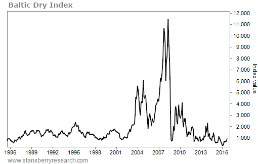To see the impact of the overcapacity across the entire commodity sector, study the Baltic Dry Index, which measures the price of shipping bulk commodities. It's a great indicator of the basic supply-and-demand equilibrium for the entire commodity complex. The index hit an all-time low earlier this year and has only rebounded slightly because of dozens of bankruptcies among shipping firms and the resulting scrapping of ships. (Around 1,000 ships have been scrapped this year, about 7% of global capacity.) But there is likely more pain ahead... French bank Credit Agricole just warned this morning that it is preparing to set aside extra loss provisions on its $15 billion shipping portfolio this year.