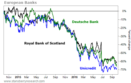 The European Central Bank estimates that European banks hold bad loans totaling nearly 1 trillion euros – that's the equivalent of 9% of euro-area gross domestic product (GDP). Italy's Banca Monte dei Paschi di Siena, the oldest bank in the world, needs to raise 5 billion euros of equity (on top of the 8 billion it has raised in the past few years) and dump 28 billion euros of bad debt. The bank is also considering encouraging its bondholders to swap debt for equity – essentially admitting default. Its shares are down 85% this year. Italy's UniCredit is also doomed... As are banks like Banco Popular Espanol SA.
