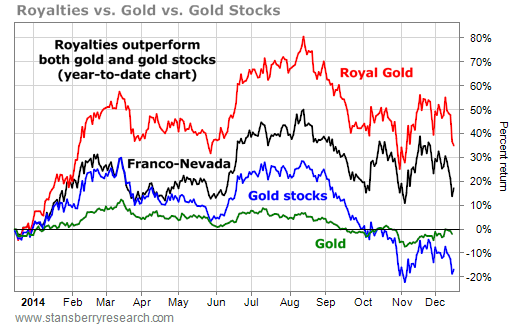 As you can see, gold royalty firms Franco-Nevada (FNV) and Royal Gold (RGLD) consistently outperform gold and the Market Vectors Gold Miners Fund (GDX), which holds a basket of major gold stocks...