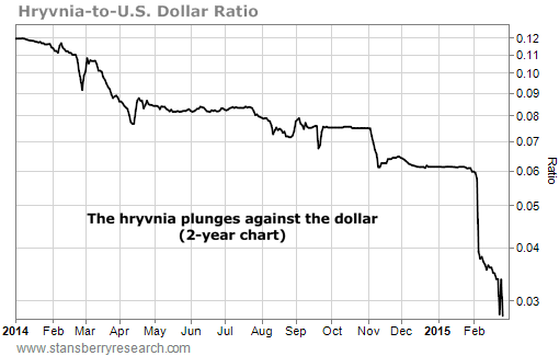 This is what happens when people lose faith in a currency. They will do anything to dump it. Take a look at this chart of the hryvnia-to-dollar ratio. It's an incredible move for a currency...