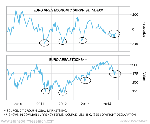 And we could see a much bigger rally in European stocks. Investment-research firm BCA Research shows that bounces off the bottom of the Citigroup Economic Surprise Index – which measures the difference between reported economic data and consensus estimates – have signaled big rallies in European stocks since 2010...
