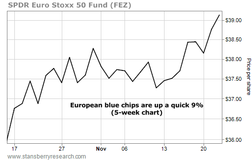 As you can see from the chart below, the SPDR Euro Stoxx 50 Fund – a fund holding an index of European blue chips – has rallied from its October lows...