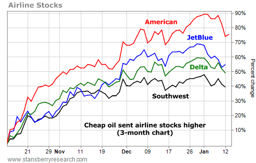Airlines are enjoying cheap oil, too. Airlines profit margins are directly linked to oil prices. And this "boom and bust" sector is now in full "boom" mode. Southwest Airlines, JetBlue, American Airlines, and Delta Air Lines are up nearly 50% on average over the last three months.
