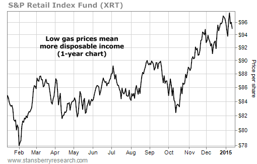 Lower gas prices mean a few extra bucks in the budget for most Americans. And they're not wasting any time spending that cash. As we noted in the January 8 Digest, we're seeing new highs across the retail sector... Wal-Mart and Target, home-improvement stores Home Depot and Lowes, drugstore chains CVS Health and Walgreens, and clothing retailers TJ Maxx and Macy's are up an average of 20% since mid-October.