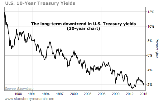 One of the longest standing trends in the world right now is falling yields on U.S. Treasury bonds. Interest rates on the benchmark 10-year Treasury peaked at nearly 16% in 1981... And they've been falling ever since. Today, the annual yield you'll earn for loaning your money to the U.S. government for 10 years is just under 2%.