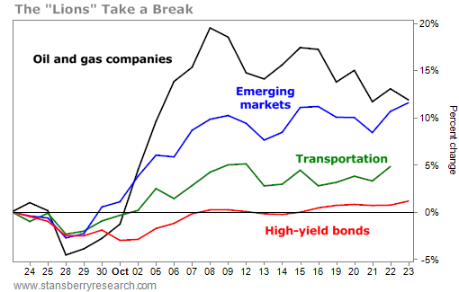 But before we discuss anything else, I want to update you on the "lions" I warned about last month. I was concerned about a bear market developing in U.S. stocks because bear markets had already developed in emerging-market stocks. Likewise, prices of corporate bonds were falling, mostly because of weakness in the price of oil. And most worrisome of all, the Dow Jones Transportation Average Index was well into a correction. As I explained...