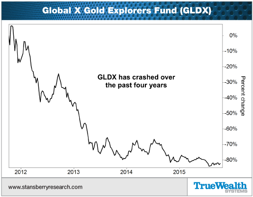 Gold-exploration companies have been decimated over the past four years. They're down nearly 90% since April 2011. Take a look...