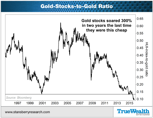 The only time this ratio has been this low in the past was in late 2000 – and gold stocks soared by 300% in the two years after that.