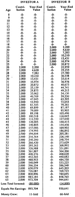 Now study the incredible results. B, who made his contributions earlier and who made only seven contributions, ends up with MORE money than A, who made 40 contributions but at a LATER TIME. The difference in the two is that B had seven more early years of compounding than A. Those seven early years were worth more than all of A's 33 additional contributions.