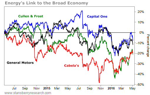 Likewise, a lot of the employees of the greater energy/transportation complex have a credit card or a car loan with Capital One Financial (COF). Losses are mounting there, too, and its shares are down 9% over the last two years. Finally... what do all of these oil workers drive? A truck, of course. And who makes most of the trucks in the U.S.? General Motors (GM), whose shares are down 13% over the last two years.