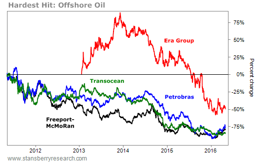 And it's not just the oil companies and the drilling firms. An entire industry is built around supplying these offshore cities... maintaining them... powering them... insuring them. Era Group (ERA) operates a huge fleet of helicopters that ferry men and supplies to rigs in the Gulf of Mexico. Rigs that are being turned off, one by one. Its shares are down 50% since the company went public and down 68% over the last two years.