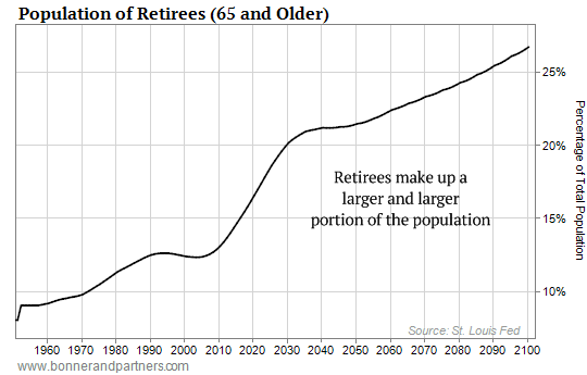 Today's edition of our weekend Masters Series originally appeared in the February issue of The Bill Bonner Letter. In it, Bill explains why the aging U.S. population and dangerously underfunded programs like Social Security will eventually trigger a crisis...