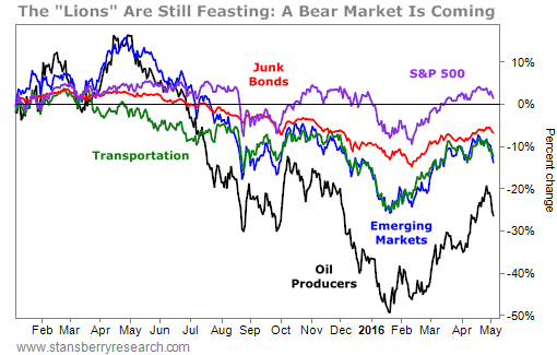 We described the main problems in the markets as "lions": Collapsing oil prices, as measured by the VanEck Vectors Unconventional Oil & Gas Fund (FRAK)... the debt problems of the emerging markets, as measured by the iShares MSCI Emerging Markets Fund (EEM)... the weakness in U.S. high-yield bonds, as measured by the iShares iBoxx High-Yield Corporate Bond Fund (HYG)... and the resulting decline of the economically sensitive U.S. transportation sector, as measured by the Dow Jones Transportation Average (^DJT).