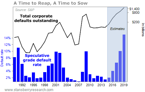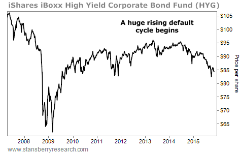 At the end of 2014, only 1.42% of speculative corporate debt had gone into default for the year – near a record low. The only better year for speculative corporate debt in recent history was the top of the mortgage-debt boom in 2006. As you know, two years later, disaster struck. A new low for defaults in 2014 points to 2016 as the year when corporate debt will begin a new default cycle.