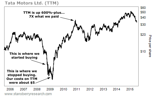 As you can see in the chart below, we started buying Tata in September 2008 and kept at it until January 2009. Our average cost for the stock was about $5. By the end of 2009, Tata was trading for about $16. We'd made more than 220% in less than a year. By November 2010, Tata stock was trading at $36... a 520% gain in less than two years.