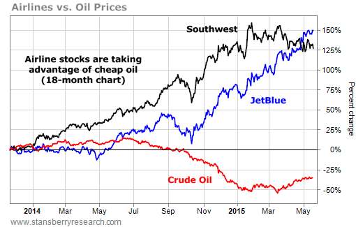 Over the last 18 months, JetBlue and Southwest shares are up 130%-plus, while the price of West Texas Intermediate crude oil is down more than 35%...