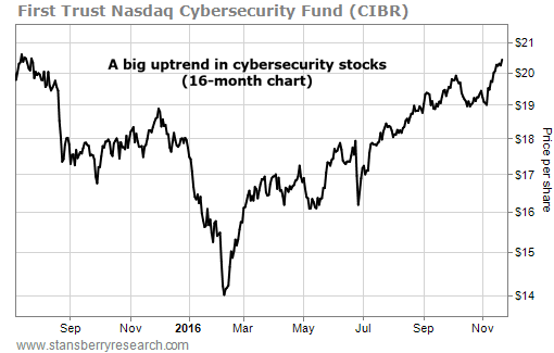 As our colleague Ben Morris told his DailyWealth Trader subscribers last fall, this means the demand for cybersecurity solutions is likely to soar as they do. As he wrote in the November 22, 2016 issue...