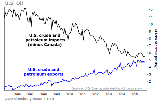 As you can see from the following chart, minus Canada, the U.S. is importing less and less oil. Meanwhile, U.S. petroleum exports are on the rise... and set to increase further now that Congress has lifted the restrictions on crude-oil exports...