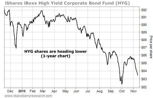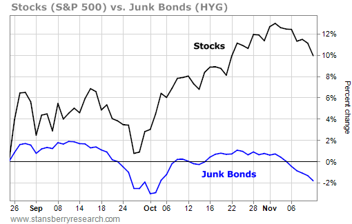 As we've discussed many times in recent weeks, stocks have rallied strongly off the lows in August... but high-yield bonds haven't. As you can see in the following chart, these bonds – as represented by the iShares iBoxx High Yield Corporate Bond Fund (HYG) – have dramatically lagged the stock market since its August lows...