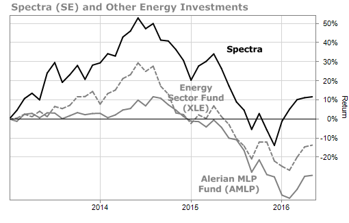 Pair that with the stability of its incoming fee payments from contracts, and Spectra is on the safe end of the oil market. That's why the yield on its bonds is low – investors consider them safe. And while other stocks suffered in the oil crash, Spectra outperformed over the last three years...