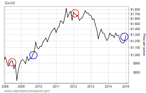 The blue circle marks times when Jeff's "buy" indicator is flashing. As you can see, the last time this indicator flashed in 2009, the gold price soared from about $1,000 an ounce to its highs near $1,900.