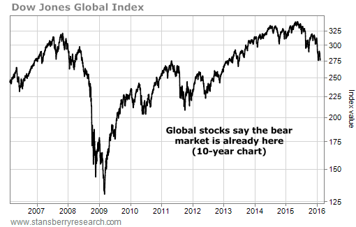 The Dow Jones Global Index – a broad measure that tracks the performance of 95% of the world's investable stock markets, including 25 developed markets and 23 emerging markets – is dangerously close to "official" bear market territory.