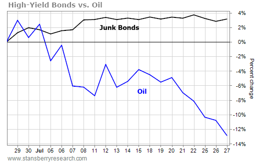 But late last month, that changed. As you can see in the chart below, high-yield bonds have continued higher, while oil has plunged...