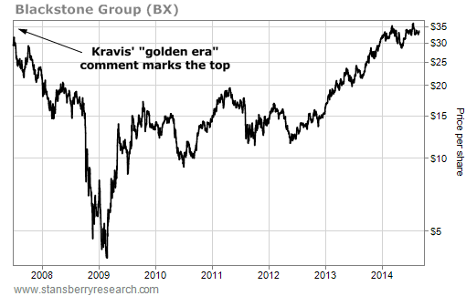 But Kravis didn't just make his "golden era" statement. It came in May 2007... And it marked an almost exact peak of the market. At the same time, Blackstone Group, the world's largest private-equity firm, was going public (another sign of the top).