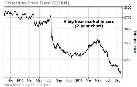To take advantage of higher prices, farmers started planting more and more corn. So much that now, supply is outpacing demand... causing corn to enter "bust" mode. At around $3.30 per bushel today, the price of corn has fallen more than 60% since its 2012 high.