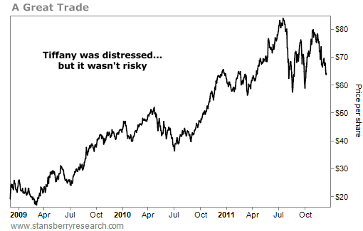 On the other hand, if you're able to look at the trade objectively, you'll see that there's virtually no risk at all. For us to lose money on this trade, Tiffany shares would have to trade below $14. That would be an additional 33% decline from its rock-bottom price of $21. And outside of a nuclear bomb going off in New York City, there's just no realistic way Tiffany would fall that far, that fast. It isn't a leveraged financial stock. It isn't in a commodity business. It's one of the world's truly great businesses. It wasn't going to fall 33% more in just 90 days.