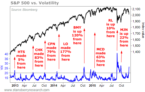 But is it possible to actually time the market this way? Yes. It's easy. You don't have to try to predict when the market will panic. You just have to wait until it does. In our Stansberry Alpha newsletter, we've established positions 13 times around spikes above 20 in the VIX. We've made money on these trades 85% of the time, producing annualized returns on margin of 50%.